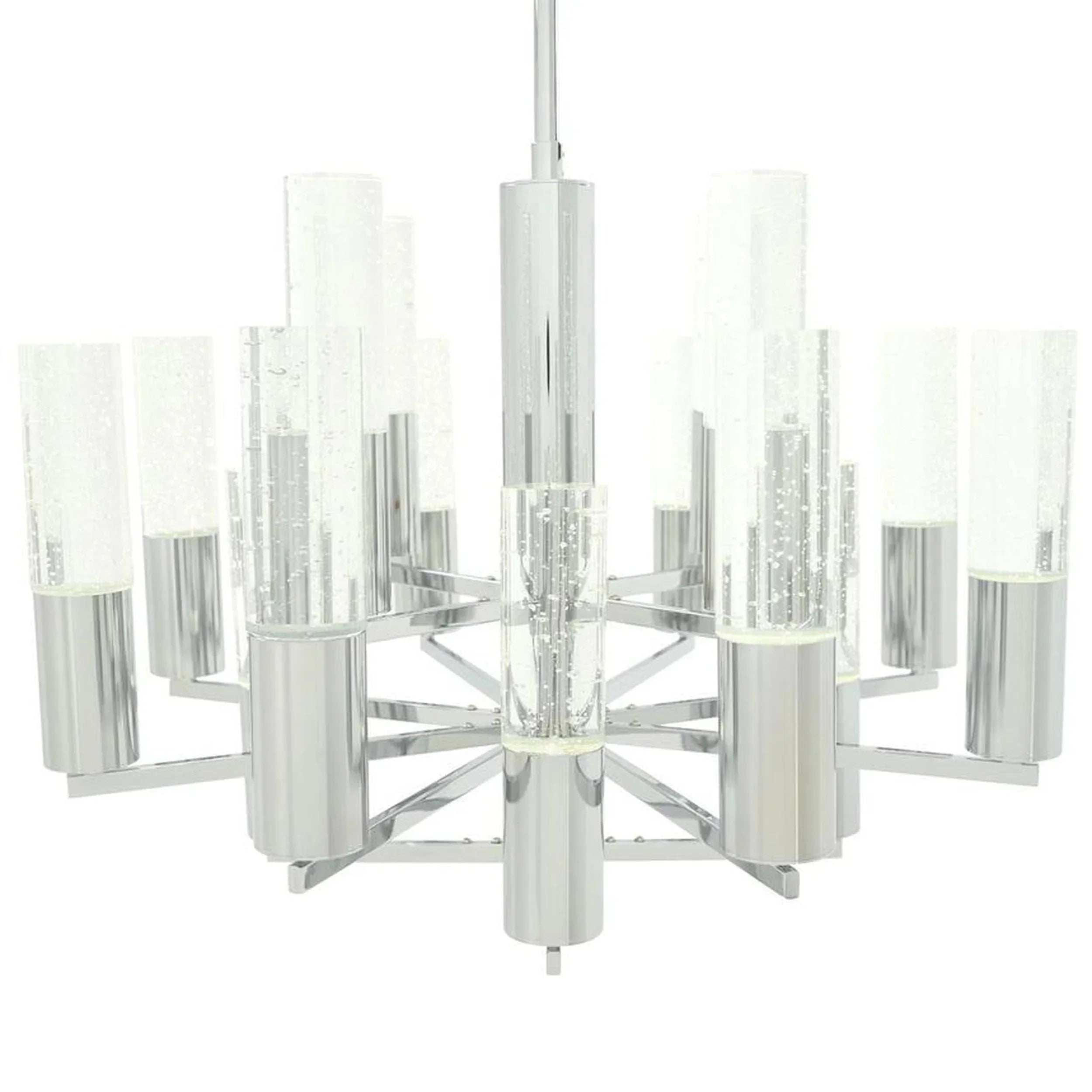 Brighten your home with the 16 lights Crystal Chandelier. The aluminum frame is combined with crystal rods. creating a stunning look that will leave a lasting impression in your dining room or foyer. There are a total of sixteen lights. which are dimmable so you can decide how bright or dark you want the setting to be.